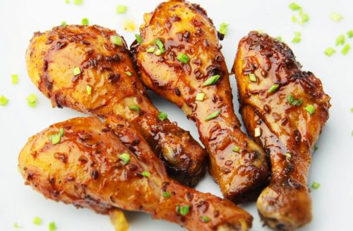 - Пикантный сладковатый вкус и хрустящую карамельную корочку курочке можно придать за счет маринада из соевого соуса и меда. Смешать 10 ст.л. соевого соуса с 3 ст.л мёда, выдавить сок лимона и добавить карри с черным молотым перцем. Крылышки держать в маринаде около 4 часов, голени и бедра лучше оставить на ночь.