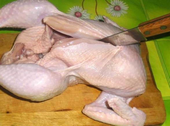 Курицу разделываем, спинную часть с лишней кожей убираем, ее использовать мы не будем. Куриную грудку отделяем от кости, а ножки и крылья по желанию разделяем по суставам.
