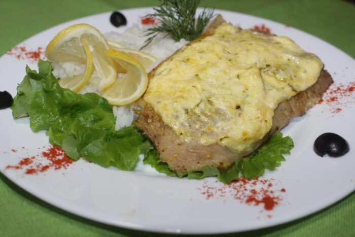 - В емкости смешивается оливк. масло, соевый соус, сок цитруса, орегано, соль и перец. Рыбка перекладывается к маринаду и оставляется на полчаса.