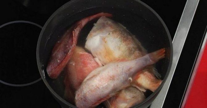 Берем 2 небольшие тушки окуня, обрабатываем по всем правилам. Режем на средние кусочки и кладем в подходящую кастрюлю. Заливаем охлажденной очищенной водой, которая должна не только укрыть рыбу, но и быть выше примерно 3-4 сантиметра.
