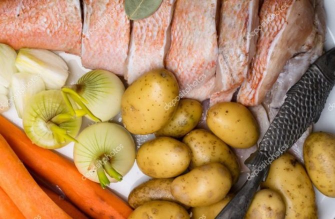 Берем свежие тушки морского окуня – 9 штук. Очищаем от внутренностей, удаляем жабры и плавник. Промываем рыбу под струей воды. Чешую не чистим – она придаст блюду особый вкус. Укладываем тушки в большую кастрюлю и наливаем сверху холодную воду. Ее должно быть достаточно, чтобы получился не очень густой бульон. К рыбе добавляем одну очищенную и разрезанную на две половины луковицу.