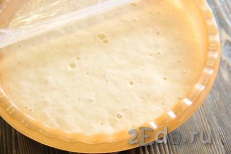 Накрыть миску с тестом для шанежек пищевой плёнкой и оставить на 1 час в тёплом месте. Тесто немного увеличится в объёме и запузырится.