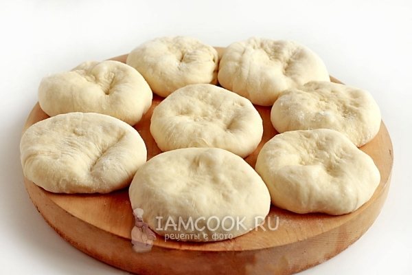 Разделить тесто на равные кусочки, сформировать шарики и приплюснуть их в лепешки.