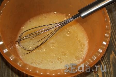 - Оставшийся сахар соединить с яйцами и второй частью молока. Взболтать смесь.