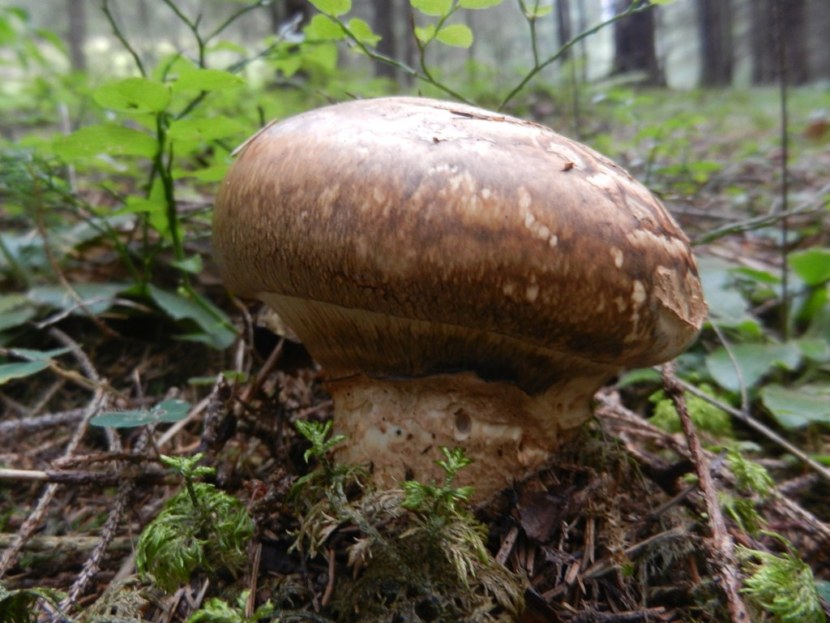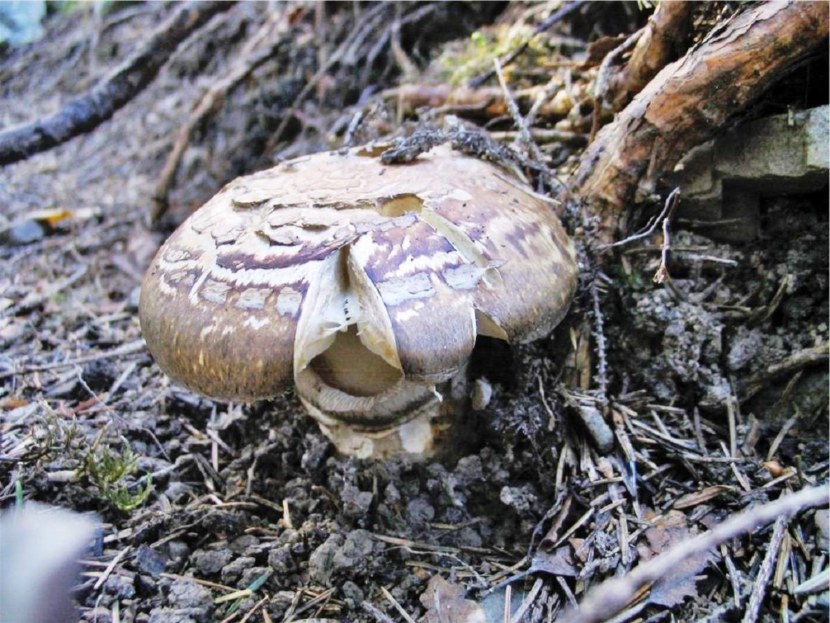 С нижней стороны шляпка покрыта белыми пластинками, которые при повреждениях темнеют, принимая коричневый оттенок. Ножка также коричневая, но всегда заметно светлее шляпки. Ее длина колеблется от трех до девятнадцати сантиметров при среднем диаметре около сантиметра.
