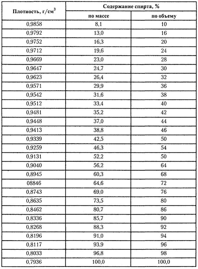 - Плотность и состав водно-спиртовой смеси определите по справочнику или по таблице ниже (плотность будет соответствовать содержанию спирта по объему).