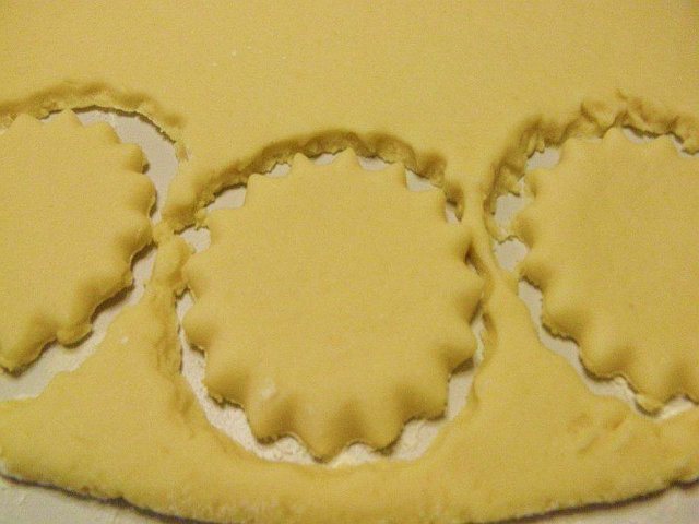 Присыпаем мукой рабочую поверхность. Раскатываем тесто в пласт, толщиной приблизительно 0,5 см, и вырезаем коржики, использую формы или стакан (или просто ножом).