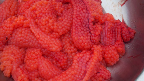 2. Если икра уже дала сок, а это свидетельствует о низком качестве товара или нарушении способа хранения, имеет смысл заменить тузлук. Для этого в кипящую воду нужно сыпать соль до тех пор, пока она не перестанет растворяться (народный способ, если сырая картошка всплывает, значит тузлук готов). Икру необходимо высыпать на марлю и несколько раз окунуть в холодный тузлук. Увлекаться процессом не стоит, т.к. можно пересолить продукт. Учитывайте, что когда икру солят в домашних условиях, ее вымачивают в среднем 15 минут, вы же ее просто промываете.