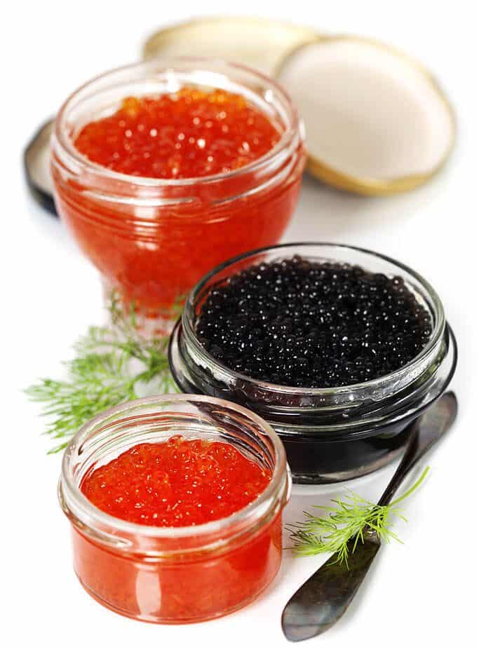 - Красная икра лососевых пород рыб, таких как горбуша, семга, кета, форель, нерка.