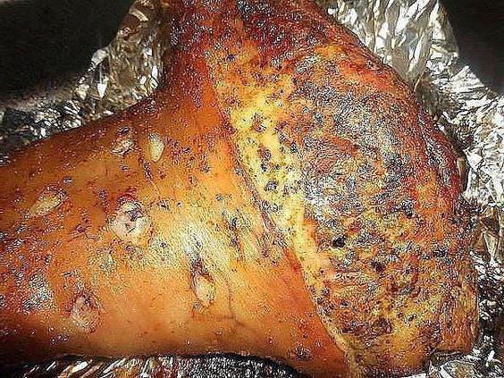 - Противень застелить фольгой и выложить на нее смазанный соусом окорок.