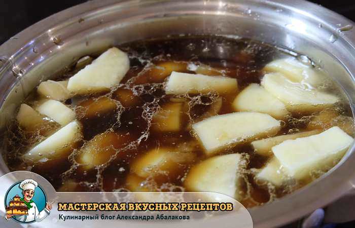 - Обжарить слегка на сковороде, взять немного бульона и залить ее.