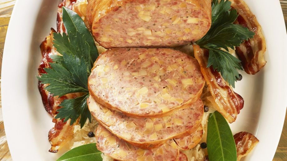 В начинку сальтисона можно выкладывать все виды мяса, нарезанное кусочками сало, специи и овощи.