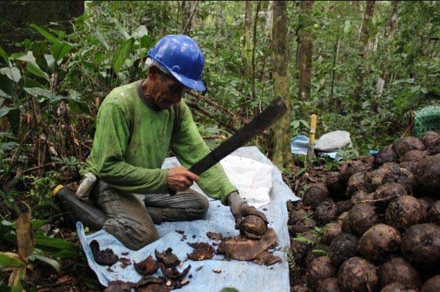 Плоды собирают с ноября по март. Уборка урожая осуществляется вручную. После созревания орехов рабочие разбивают в джунглях лагеря и бродят по лесу в поисках плодов. Собранные орехи они открывают при помощи мачете, складывают их в мешки и затем доставляют на перерабатывающие заводы близлежащих городов.