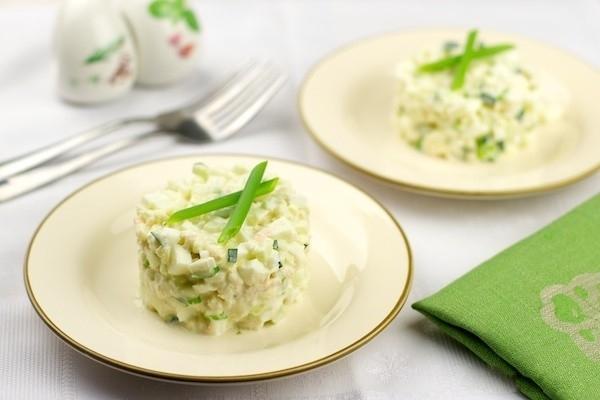 Ингредиенты: Мясо криля — 300 гр, Рис — 100 гр, Яйца — 2 шт., Огурцы — 1 шт., Яблоки (зеленое) — 1 шт., Майонез — 3 стол.л., Перец черный молотый — по вкусу, Соль — по вкусу Приготовить ингредиенты. Рис отварить до готовности в подсоленной воде. Затем откинуть рис на сито и охладить. С криля слить воду, мясо размять вилкой. Яблоко вымыть, очистить от кожуры и семян и нарезать мелкими кубиками. Огурец вымыть, обсушить и нарезать.