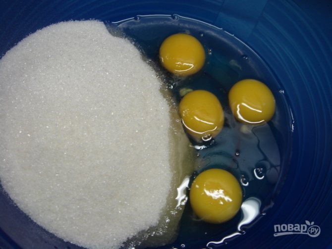 1. В миску вбейте куриные яйца, добавьте к ним сахарный песок и взбивайте до образования посветлевшей смеси.