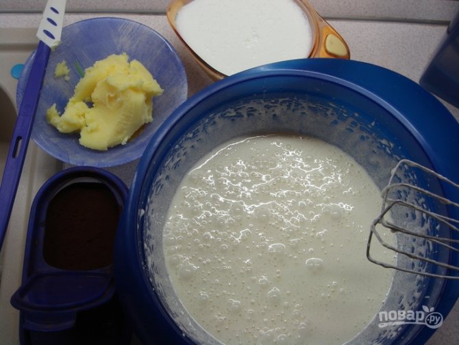2. Взбивайте яичную смесь и понемногу добавляйте топленое сливочное масло. В другой миске смешайте кефир с содой, введите в яичную смесь.