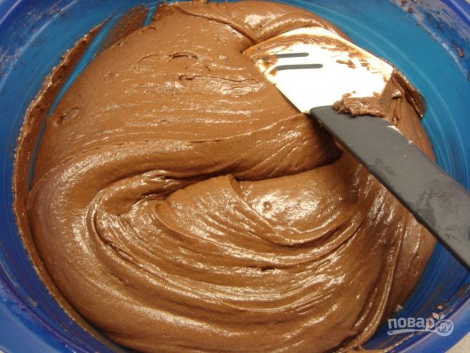 3. Смешайте муку с какао и введите к жидким ингредиентам, хорошенько все перемешайте. Перелейте тесто в форму для выпечки, отправьте в разогретый до 180 градусов духовой шкаф на 70-80 минут.