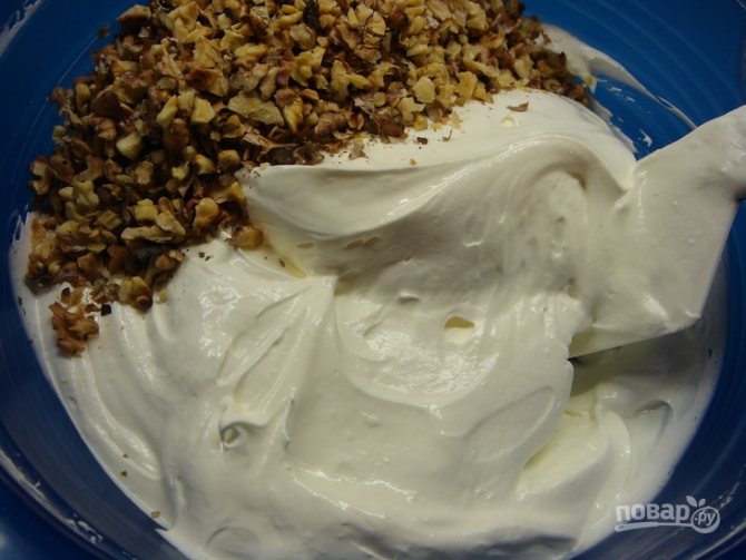 4. Жирную сметану смешайте с поджаренными грецкими орехами и сахарной пудрой.