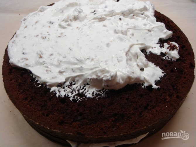 5. Готовый бисквит достаньте из духовки и остудите, затем разрежьте на 4 коржа (один сделайте самым тонким). Смажьте каждый корж, кроме одного, приготовленным сметанным кремом, а также смажьте верхушку и бока.