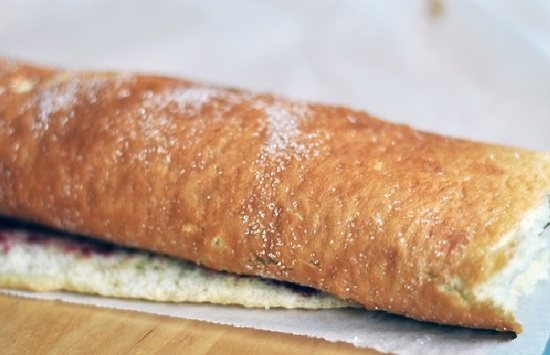 Когда бисквит немного остынет, развернуть его и смазать джемом.