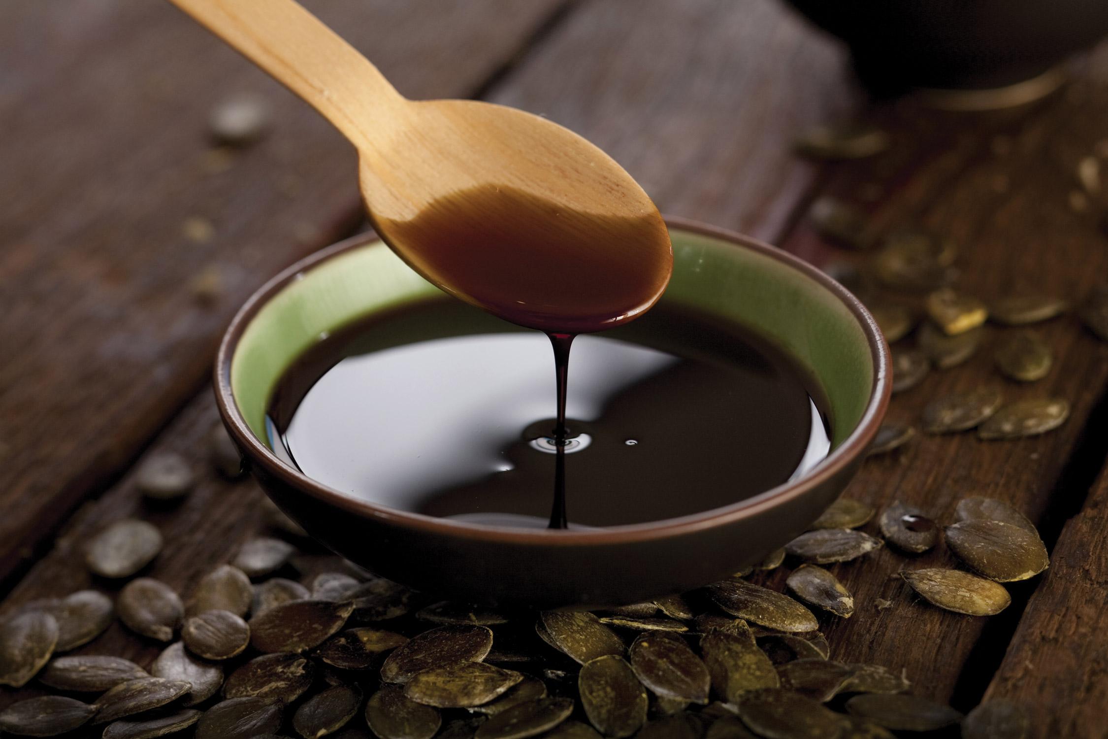Качественное тыквенное масло не растекается, если его капнуть на свежий капустный лист, и не горчит. На дне бутылки есть осадок. После встряхивания на стенках сосуда остаются жирные полосы.Блеклый цвет продукта выдает его подделку. Если смотреть на масло сверху, оно имеет насыщенный коричневый или темно-красный цвет. Если смотреть на просвет, оно приобретает выраженную темно-зеленую окраску.