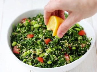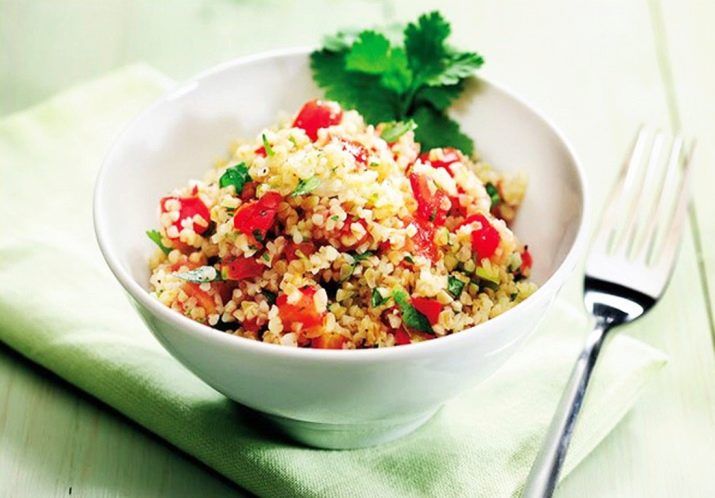 Один из вариантов салата с добавлением крупы – смешать нарезанные томаты, перец, крупно натертое кислое яблоко. Сюда же добавить зелень и листья салата, маринованный красный лук. В качестве заправки использовать смесь оливкового или льняного масла с добавлением лимонного сока. Подойдет также натуральный йогурт или кефир.