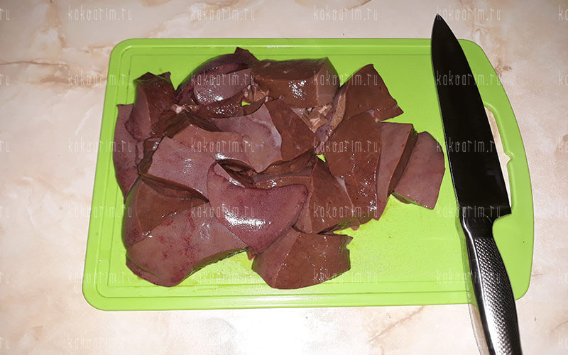 - Печень, вымыв и очистив от пленок, нарежьте кусками толщиной 3 см, вымочите в течение 2 часов в молоке или воде.