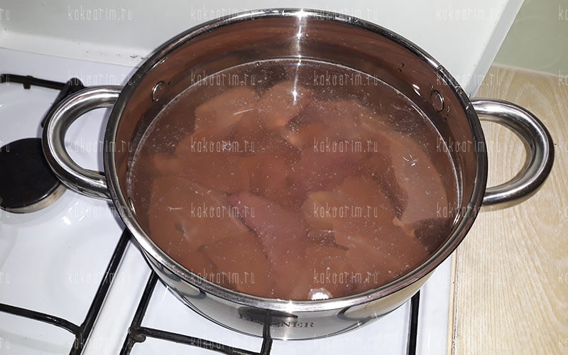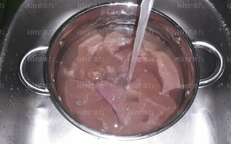 - Вымоченный субпродукт поместите в глубокую емкость, залейте холодной водой, чтобы она покрыла его полностью.
