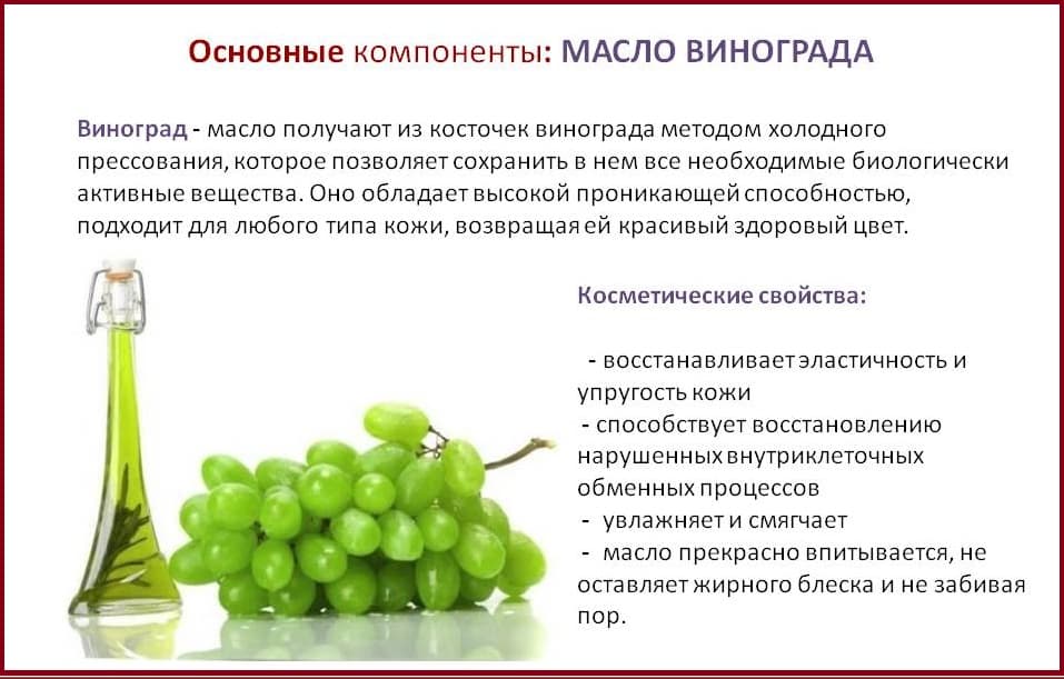 Ценность масла винограда обусловлена наличием витамина Е. Этот компонент способствует устранению мимических морщинок. Он оказывает влияние на формирование эластина и коллагена. При регулярном использовании стабилизируется деятельность сальных желез, а поры становятся меньше.