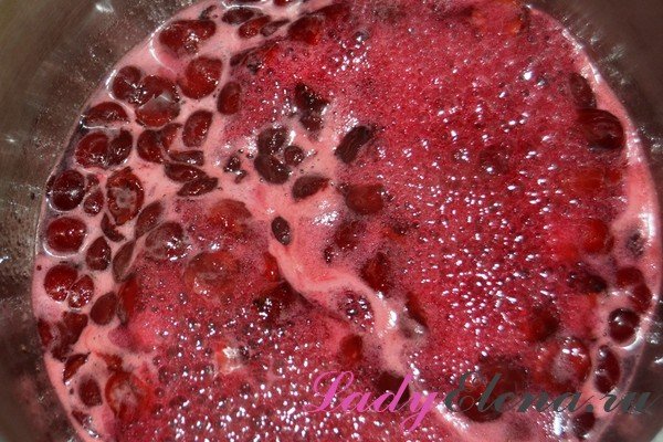- Получившуюся сухую массу необходимо переложить в ягодное пюре. Эти компоненты следует прогревать на малом огне, не прекращая постоянное помешивание. В итоге нужно добиться того, чтобы сладкие кристаллы полностью растворились в смеси.