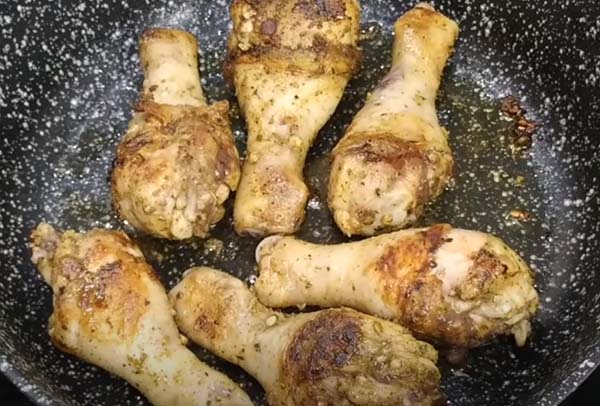 Когда ножки промариновались, обжариваем их на сухой сковороде или с добавлением небольшого количества масла.