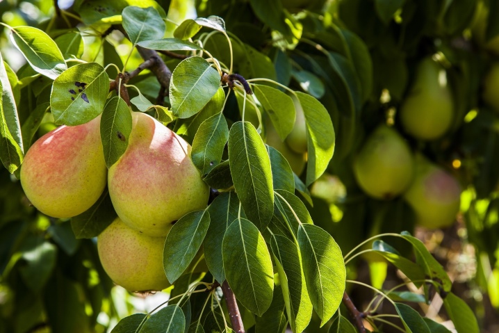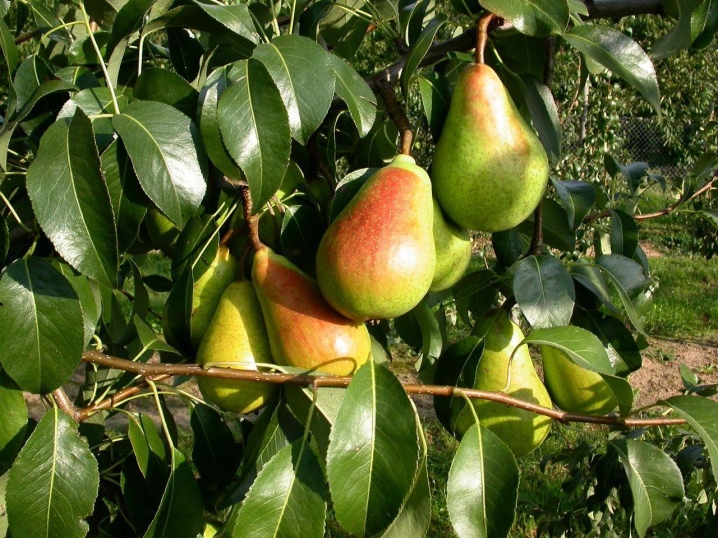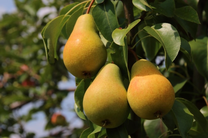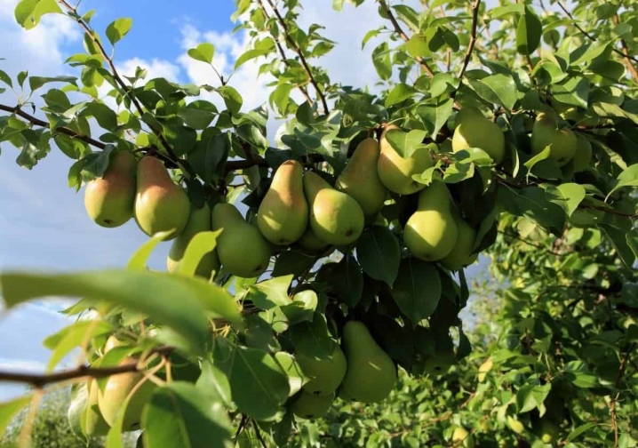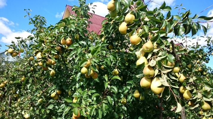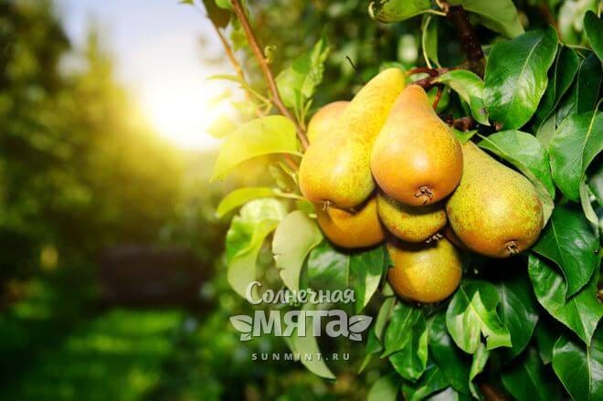Грушевые ветви прогибаются под тяжестью плодов.