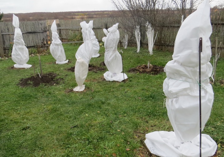 А далее все будет зависеть от возраста дерева. Молодые саженцы укрывают лапником внизу, ветви аккуратно связывают, саженец оборачивают мешковиной. Взрослое дерево в таком укрытии не нуждается, но стволы стоит защитить от грызунов, обернув материалом, обработанным отпугивающим средством, которое можно приобрести в любом садовом магазине.