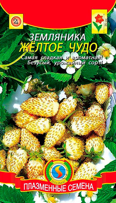 Оригинально выглядят желто-золотистые ягоды этой клубники на фоне зеленой листвы. Сорт немецкий, размножается семена или делением куста, так как на растении отсутствуют усы.