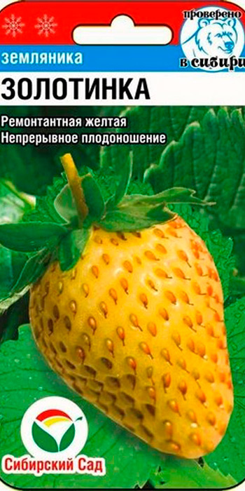 Не образуют усов и кустики Золотинки. Эта садовая клубника привлекает необычным окрасом плодов, они у нее кремово-желтые, весом 9-11 граммов. Растения достигают 18-20 см, листья темно-зеленые, с зубцами.