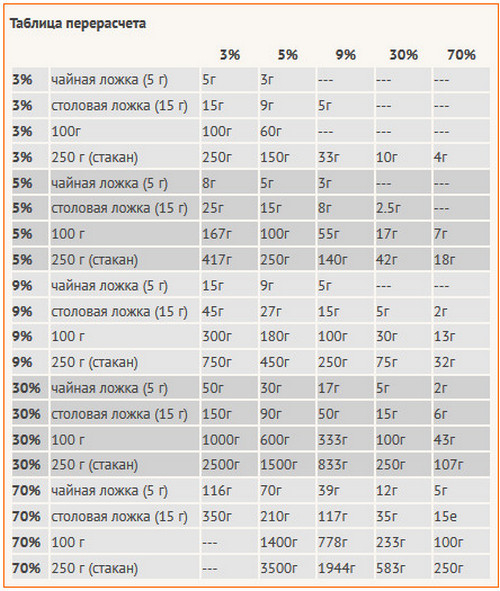 Итак, если у вас нет уксуса той концентрации, которая указана в рецепте, но есть другой уксус, воспользуйтесь этой таблицей для перерасчета. Ниже приведены конкретные примеры, объясняющие, как пользоваться таблицей.