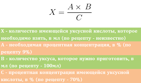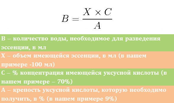 Ну а если, у вас имеется определенное количество 70% уксусной кислоты , например, 100 мл, и вам нужно развести ее всю, чтобы получить 9% раствор, то для этого можно воспользоваться следующей формулой: