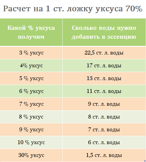 Если за основу взять 1 столовую ложку уксусной кислоты, то не составит особого труда развести ее до любой нужной концентрации с помощью все тех же столовых ложек. Для этого необходимо иметь под рукой следующую таблицу: