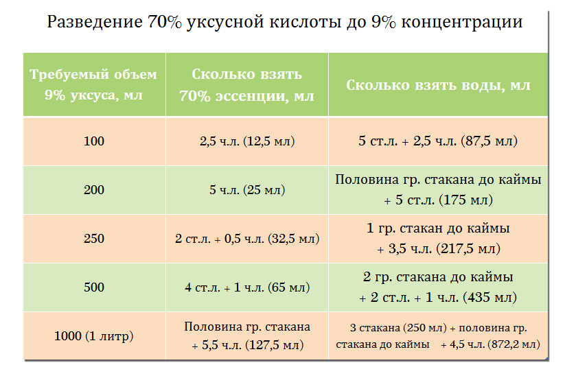 Для разведения нужного объема 9-процентного раствора достаточно уточнить в таблице, необходимое количество чайных (столовых) ложек или граненых стаканов 70% эссенции и обычной кипяченой (отфильтрованной) воды.