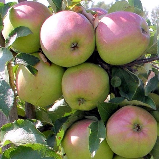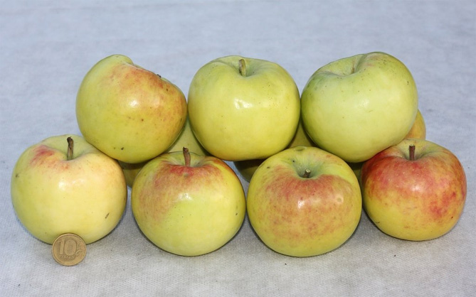Яблоки очень вкусные, душистые, прекрасно сохраняются в течение 8 месяцев. Окончательно созревшие плоды желто – зеленого цвета с красным румянцем со стороны припека. Мякоть пористая, достаточно сочная, сладко-кисловатая, с терпким и бодрящим вкусом.