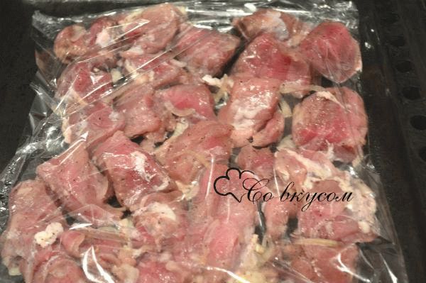Говядину режем кубиками произвольной формы. Заливаем готовым маринадом.