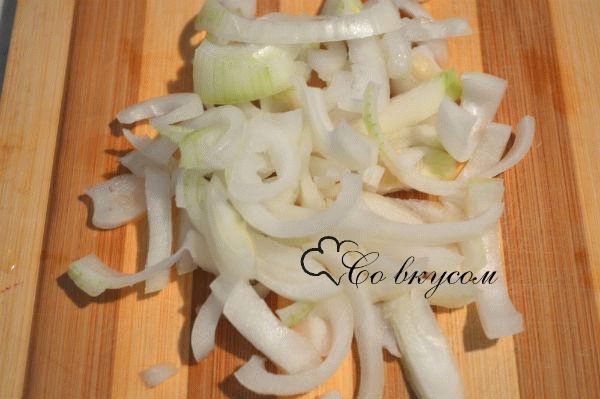 Сначала надо замариновать мясо. Для этого нам надо очистить, помыть и нарезать лук полукольцами.