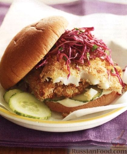5. Каждое филе разрезать пополам. На основу каждой булочки нанести примерно 2 столовой ложки соуса тартар, сверху выложить ломтики огурца, по 2 кусочка рыбы и 3/4 стакана капустного салата. Накрыть вторыми половинками булочек. Подавать бургеры сразу же.