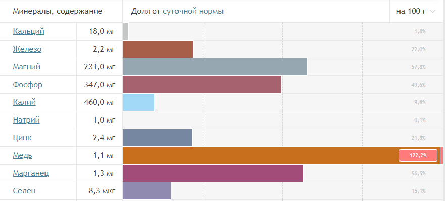 Употребляя 100 г зеленой гречки в день, Вы восполните до 80% суточной нормы марганца, 37% железа, 50% магния, 45% витамина Е, 26% витамина В1.