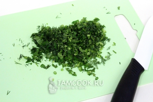 Зелень петрушки и укропа (по 1 большому пучку) измельчить ножом. Выложить в миску. Добавить по 1 ч. л. смеси перцев и соли.