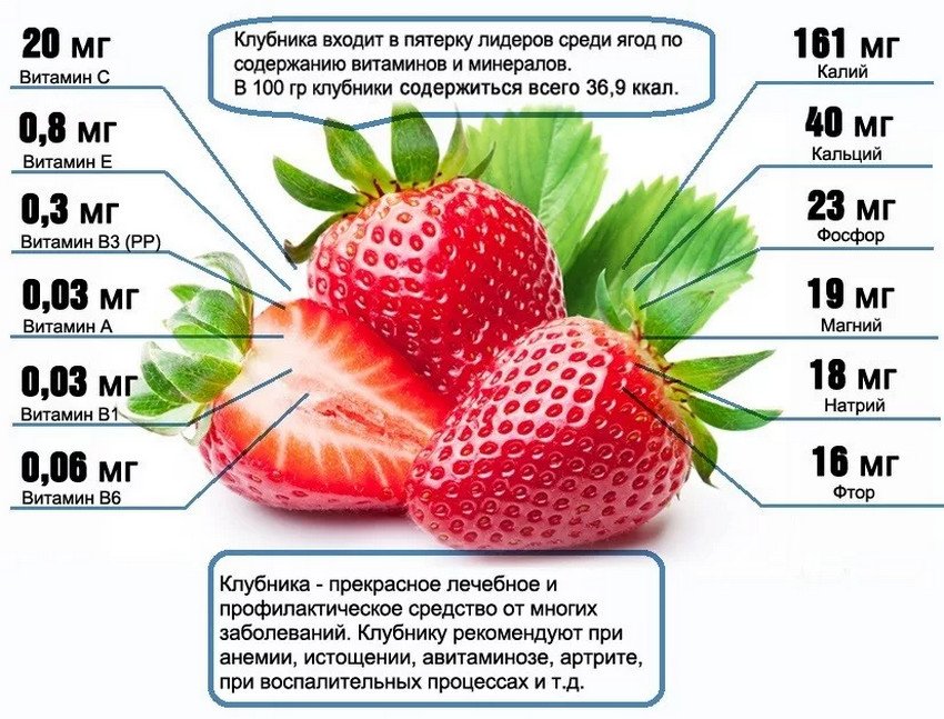 Польза клубники обусловлена комплексом витаминов, микро- и макроэлементов, содержащихся в её составе.